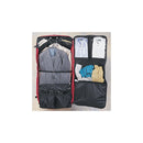 Made of modern rip-stop polyester, Inside the main compartment, there are 2 brackets to hold 8 hangers, dual mesh pockets at the top corners to hold accessories, and 4 shoe pockets on the extension bottom which holds garments up to 56" long, The opposite side features 4 large pockets for shirts, socks, sweaters, etc. 3 zip pockets outside for laundry, It's extra-large with lots of pockets, yet still lightweight, Also has a soft-grip handle and detachable shoulder strap.
