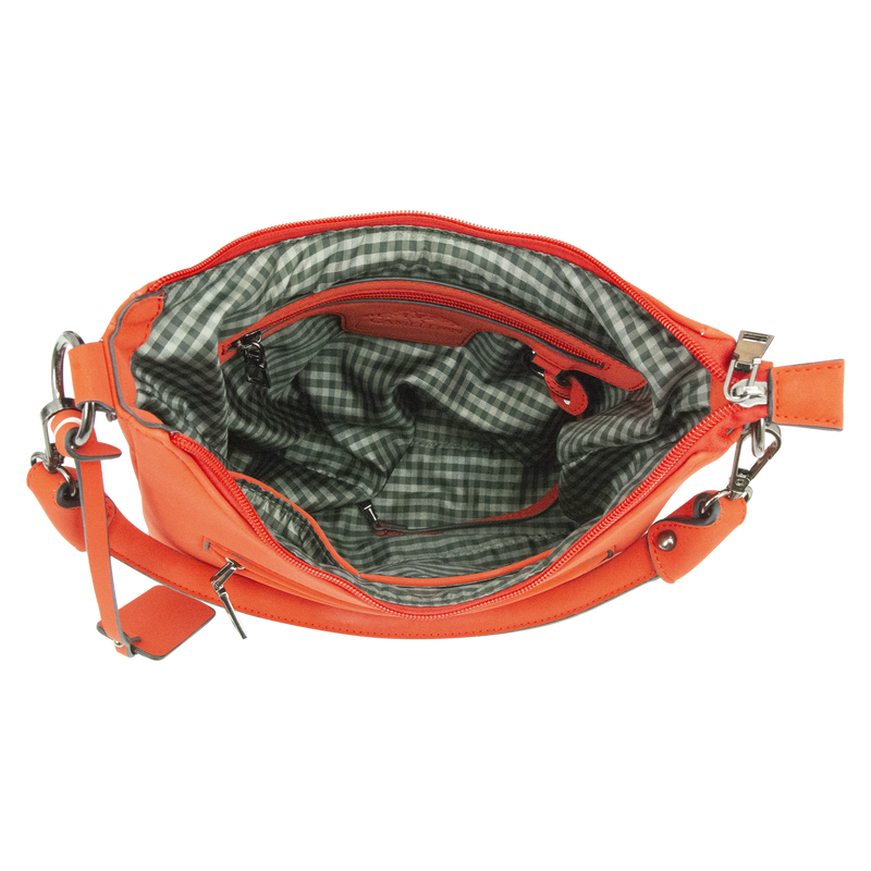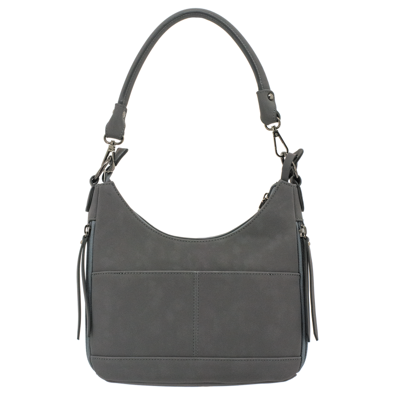 Luna has one large zippered main compartment containing two open phone pockets on one side and one zipper pocket on the other. Also includes a removable, 9-inch strap with dog hook for keys. It features one open back pocket and one front zipper pocket as well as an individual CCW compartment with ambidextrous rear access and zipper closures. The CCW compartment is padded, with velcro lining on the inner side and come equipped with a slim gun holster and our "Cameleon Tail" spandex pepper spray holder. Both come with velcro attachments to personalize the placement within the pocket for maximum comfort and confident while carrying.