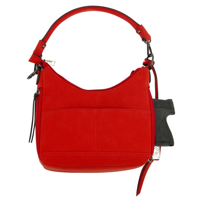The Cameleon Luna gives you everything you need in a compact personal protection purse. The compact size allows you to minimize what you carry, while still allowing you to stay prepared. Style and Functionality are not sacrificed with the Luna. We have designed the Luna to be your Personal Protection Purse. We have included the Cameleon Tail to hold your Pepper Spray or Mace and each bag comes with a secure holster for your firearm. The Cameleon Luna is available in Red and Grey and is a New Release from Cameleon Bags.