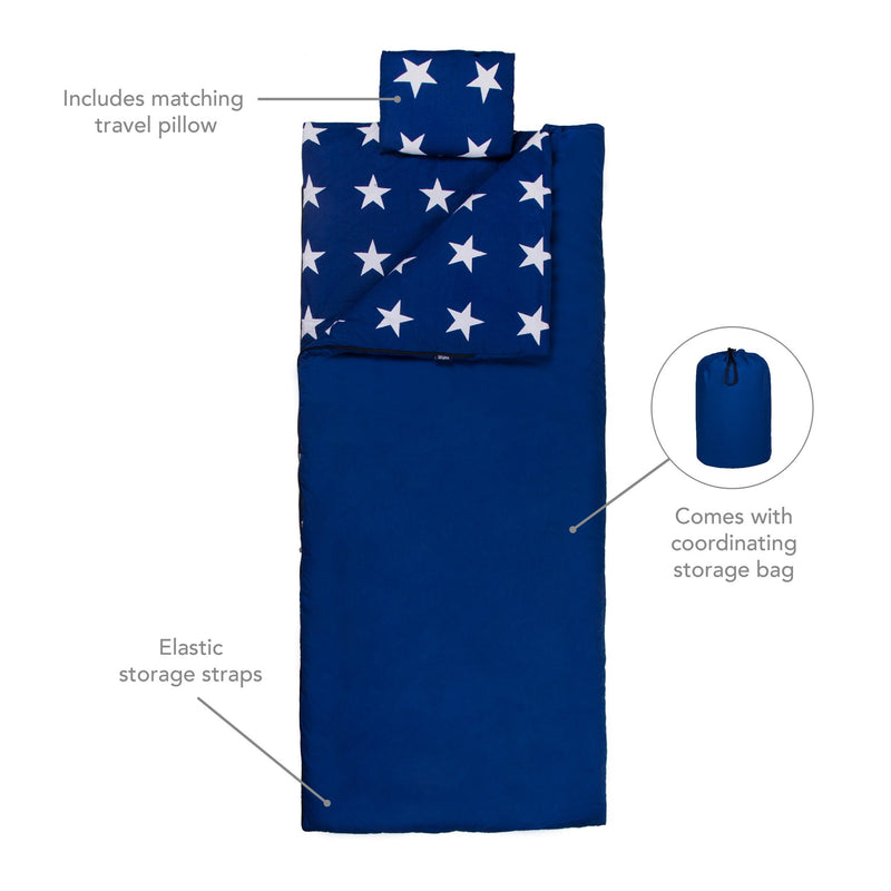 Drifting off to sleep is a breeze when your child is snuggled up in Wildkin’s Original Sleeping Bag for boys and girls! Each Kids Sleeping Bag is made from a super soft blend of cotton and polyester materials to keep your little one extra warm and cozy. The sleeping bag features a roll-up design, complete with elastic storage straps and a coordinating drawstring-close storage bag. Its travel-friendly design makes it easy for your little one to take their Sleeping Bag with them to-and-from sleepover parties, overnight travel to grandma’s house, and more. Each Sleeping Bag was designed to coordinate with other Wildkin gear. From lunch boxes, to duffel bags, to backpacks, your child will love having their favorite designs with them on-the-go. L: 57" L x 30" W.